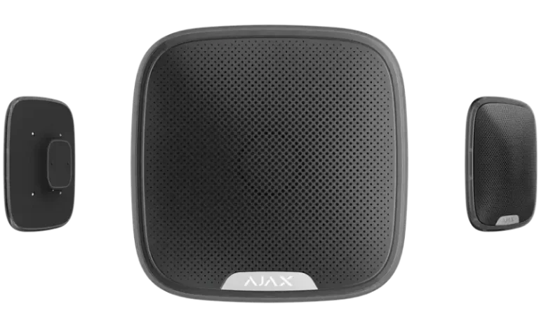 Die drahtlose "Ajax StreetSiren Double Deck black EU" Außensirene, mit einer Halterung für eine individuell gestaltbare Markenblende, signalisiert die Aktivierung eines Melders mit einem akustischen Alarm und einer LED. Lautstärke und Alarmdauer werden in der mobilen Anwendung eingestellt. Die schwarze Sirene verfügt über einen Staub- und Feuchtigkeitsschutz nach IP54. Bei Bedarf kann eine externe 12-V-Gleichstromversorgung angeschlossen werden. Der eingebaute Beschleunigungsmesser löst beim Versuch, die Sirene zu entfernen, einen Alarm aus.