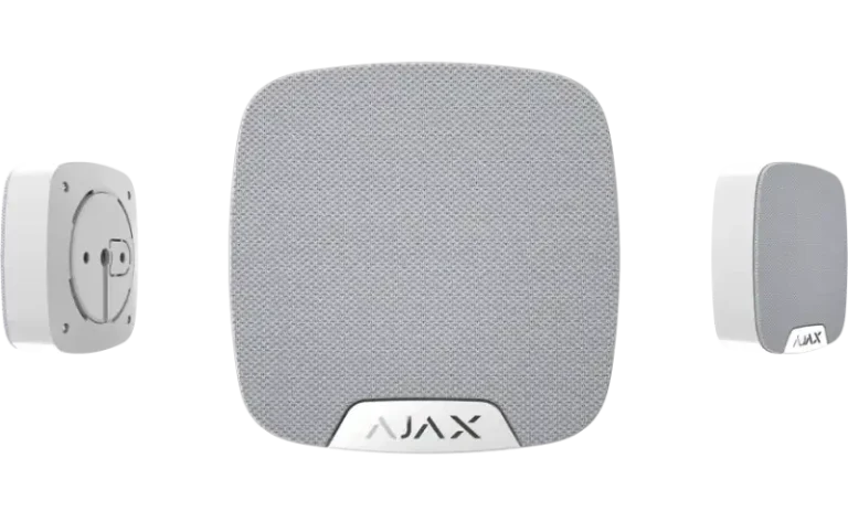 Die drahtlose "Ajax StreetSiren Double Deck white EU" Außensirene, mit einer Halterung für eine individuell gestaltbare Markenblende, signalisiert die Aktivierung eines Melders mit einem akustischen Alarm und einer LED. Lautstärke und Alarmdauer werden in der mobilen Anwendung eingestellt. Die weiße Sirene verfügt über einen Staub- und Feuchtigkeitsschutz nach IP54. Bei Bedarf kann eine externe 12-V-Gleichstromversorgung angeschlossen werden. Der eingebaute Beschleunigungsmesser löst beim Versuch, die Sirene zu entfernen, einen Alarm aus.